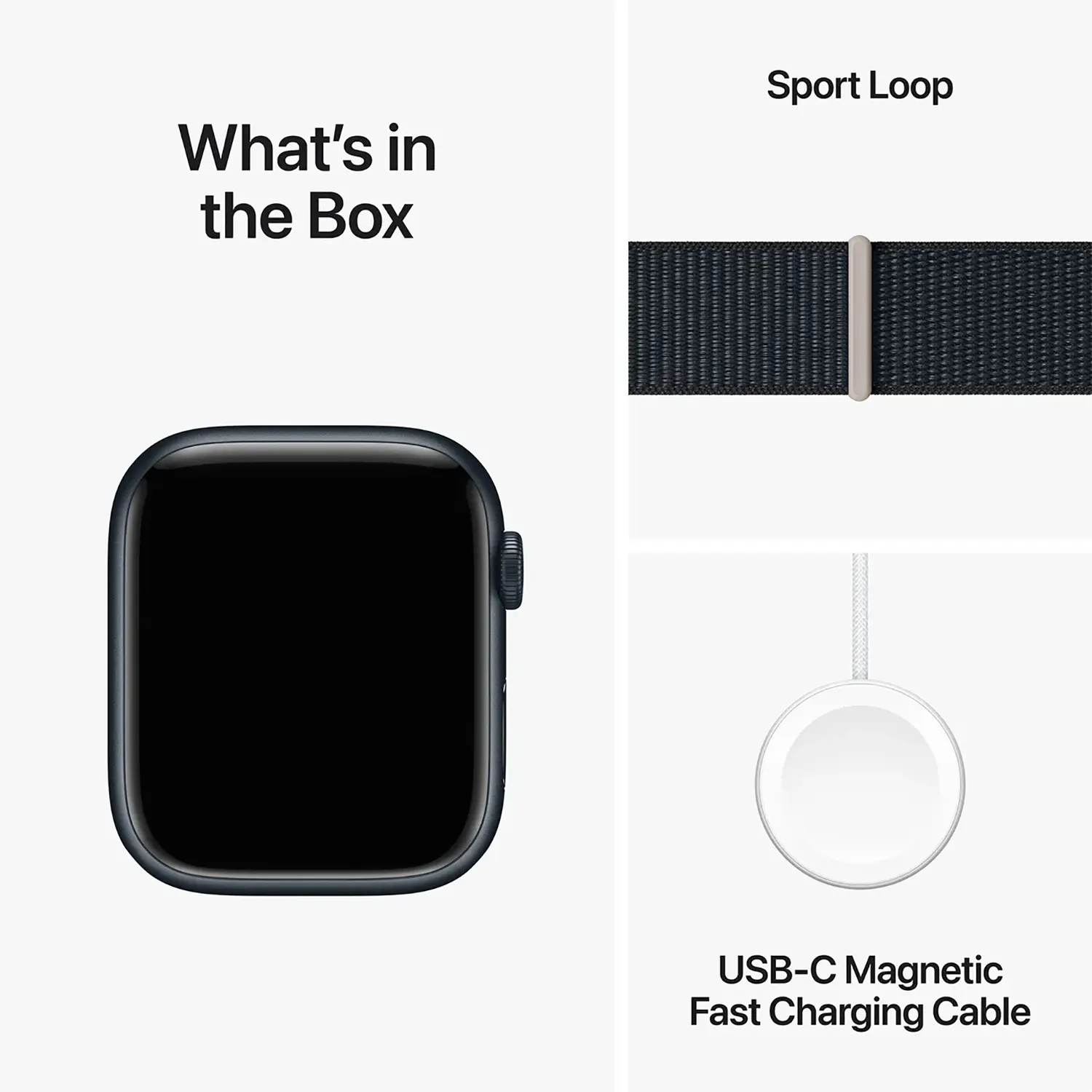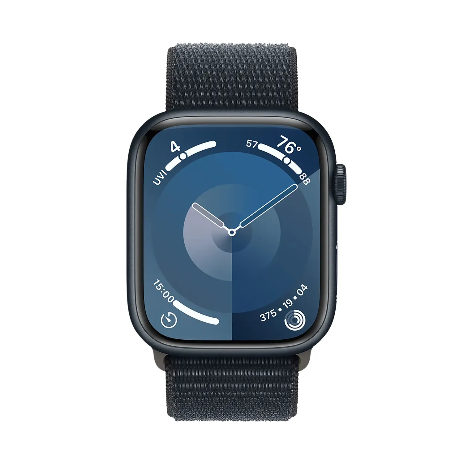 The Apple Watch Series 9 is a smartwatch with a 44 mm or 40 mm aluminum case size. It has a Retina display with a maximum brightness of 2,000 nits, which is twice as bright as the Series 8. The Series 9 also has an advanced display system that dims to 1 nit in low-light situations, making it easier to read in full sunlight.