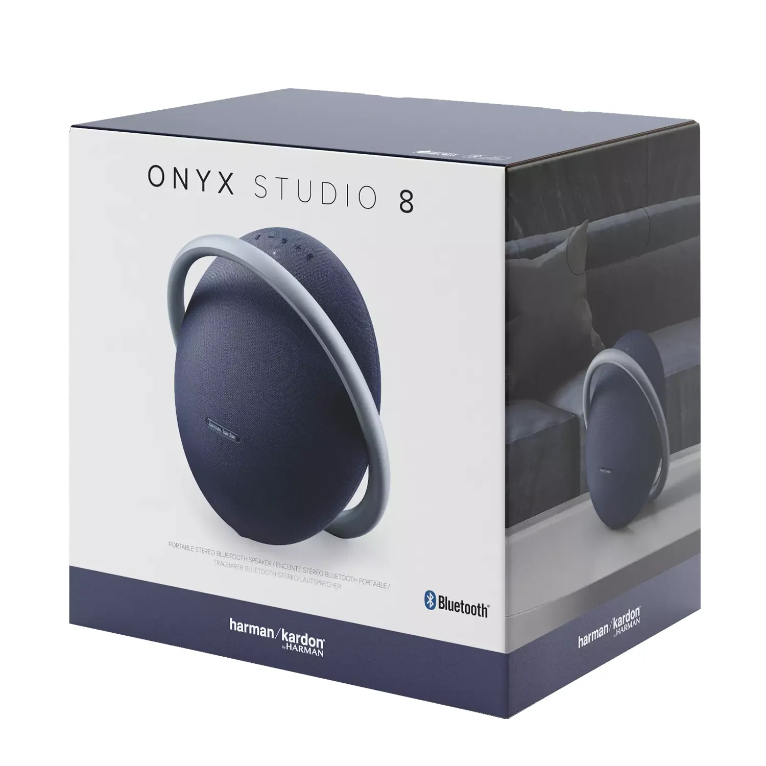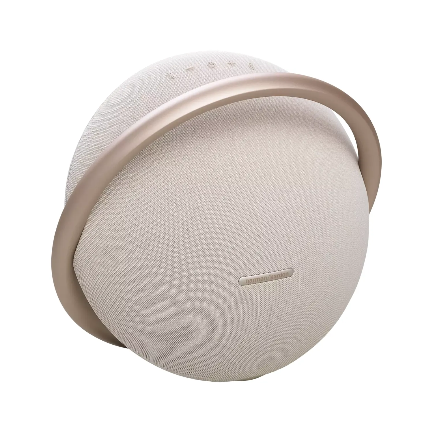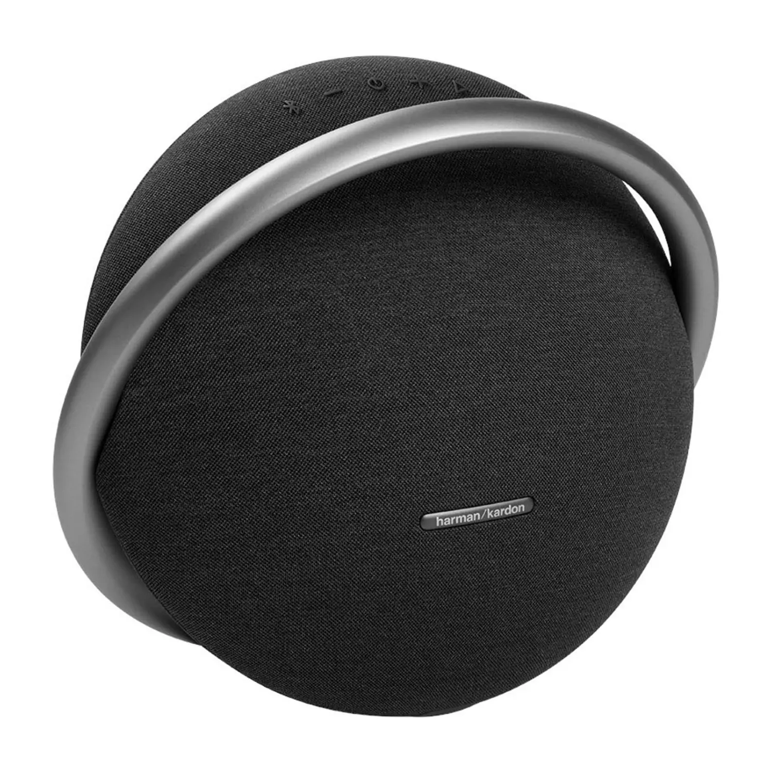 The Harman Kardon Onyx Studio 8. Both stylish and sustainable, it’s crafted from recycled materials, combining eco-friendly choices and beautiful design. Use the sleek, anodized aluminum handle to carry the portable speaker anywhere.