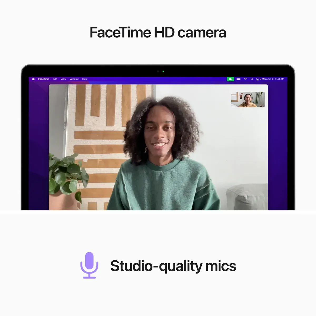 Thanks to M2, the FaceTime HD camera takes full advantage of our latest image signal processor — so you’ll look great in video calls. And whether you’re running a meeting, hosting a podcast, or connecting with friends and family, studio-quality mics will make sure everyone hears you loud and clear.
