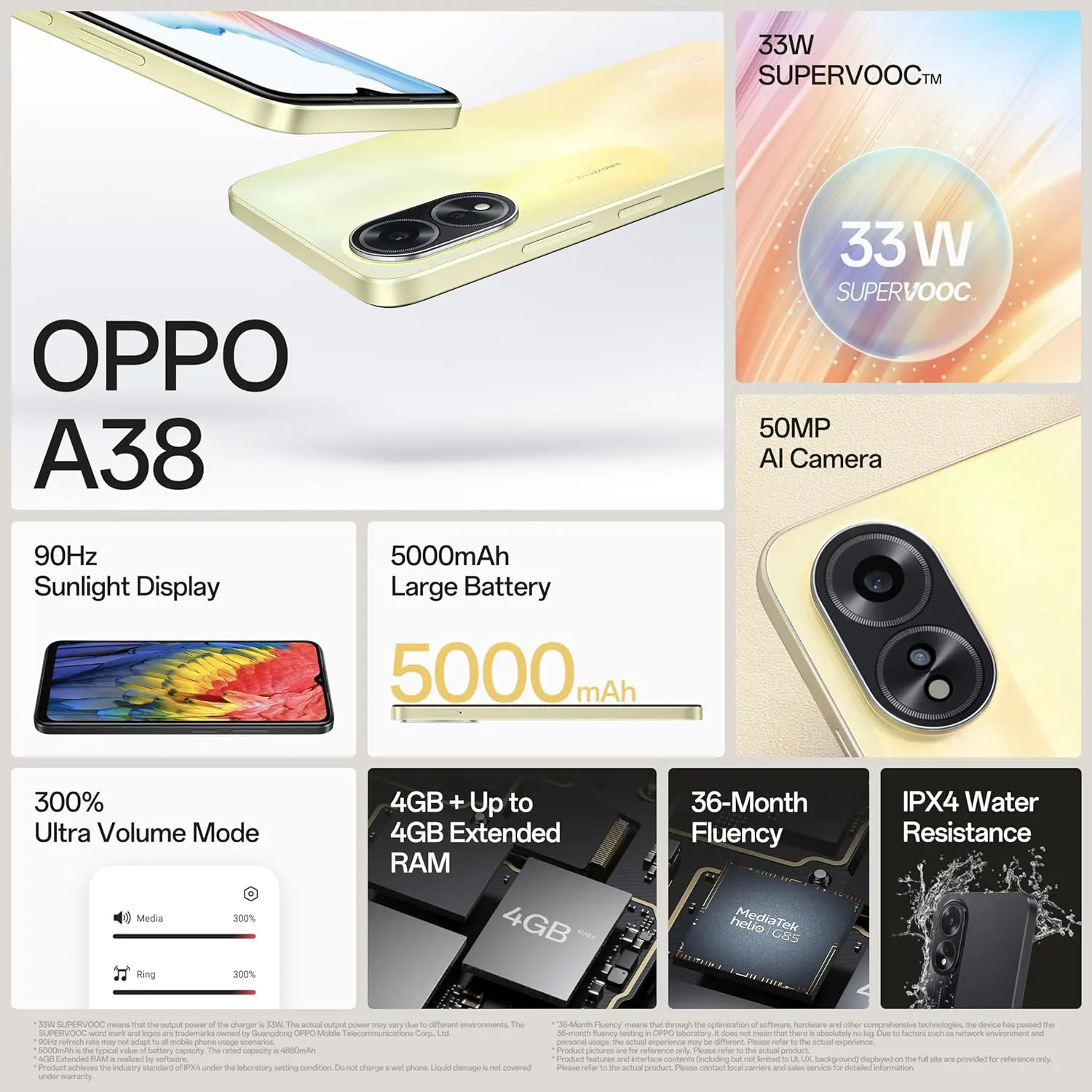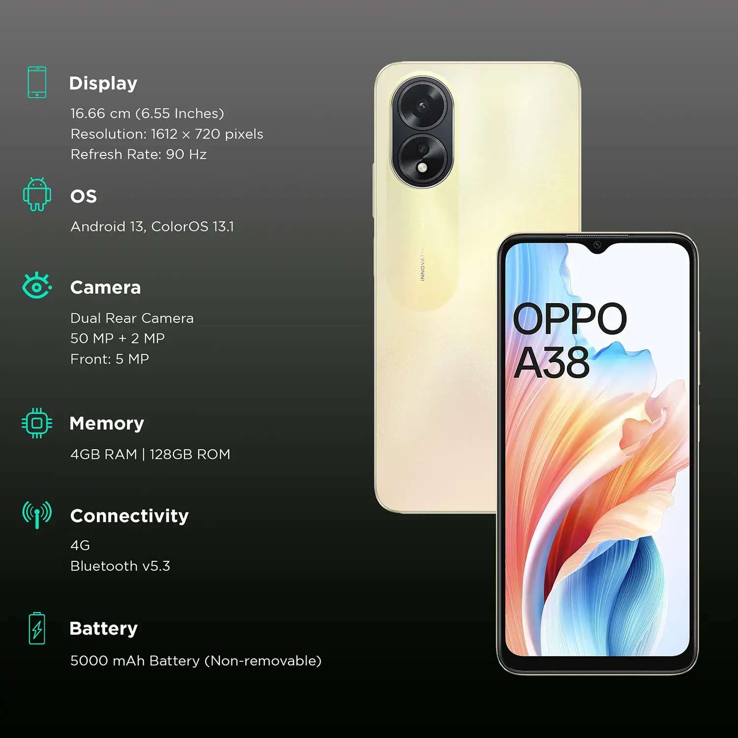 The Oppo A38 5G is a budget-friendly smartphone with a 6.56 inch IPS LCD HD Plus display, 90 Hz refresh rate, and 90 Hz touch sampling rate. It has a 50 MP main camera, 2 MP depth sensor, 5 MP selfie camera, 4 GB RAM, 128 GB storage, and a 5000 mAh battery. The Oppo A38 is also dustproof, waterproof, and stress tested.