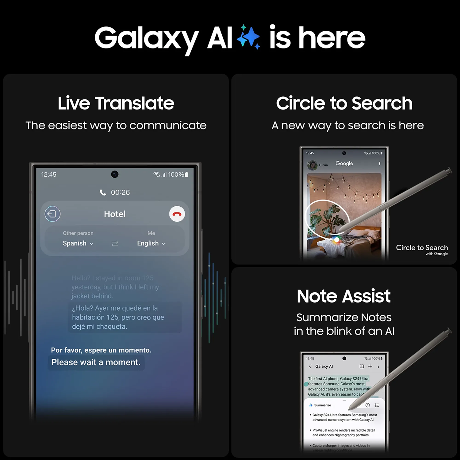 Transform your smartphone experience into the AI phone experience. Use the Galaxy S24 Ultra to stay on top of the news while saving time with Note Assist,1 summarizes written content into neat easy-to-skim bullets. Whether you’re commenting on a social post or emailing your boss, always strike the right tone with Chat Assist – giving you context-based suggestions as you type.